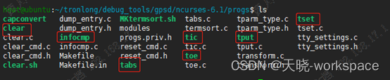 无法识别二进制文件 toe。问题和上面的 tic 类似。我们看一下 ncurses-6.1/progs 文件列表: