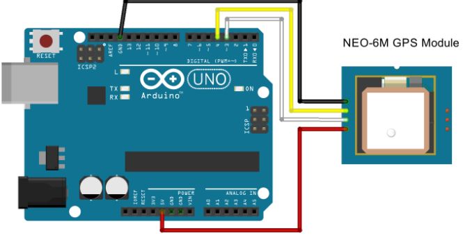 GPS模块有四个引脚:VCC、RX、TX和GND。该模块使用TX和RX引脚通过串行通信与Arduino开发板进行通信,接线简单: