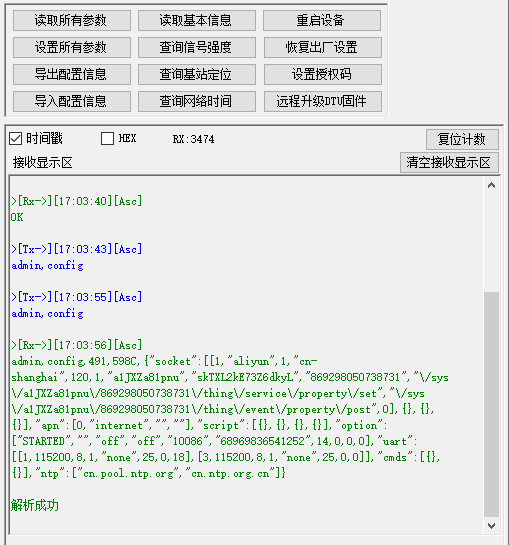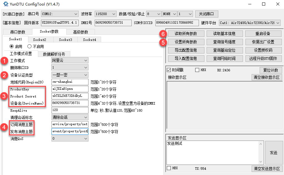 其他信息默认即可,信息填写完毕之后,我们点击⑤ 设置所有参数 ,待返回应答 OK 之后,我们点击一下⑥ 读取所有参数 按钮,确认一下参数是否已经设置成功。