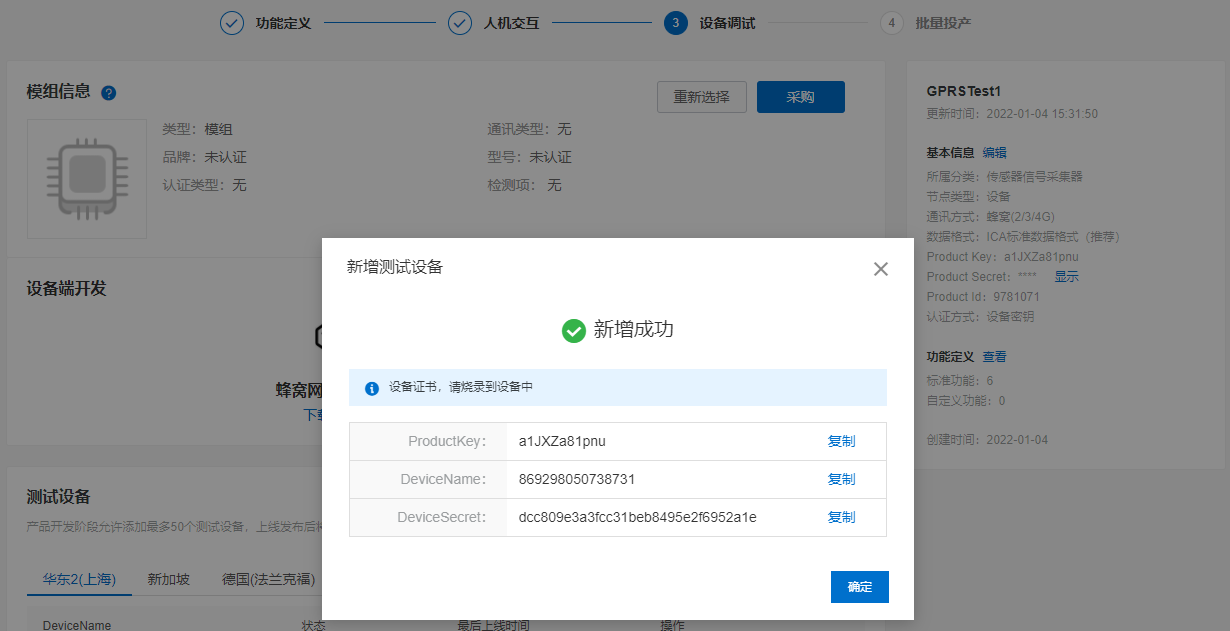 因为我们要将阿里云物联网平台上已创建好的设备和该4G模块绑定,所以②处我们填写设备认证类型为:一型一密;