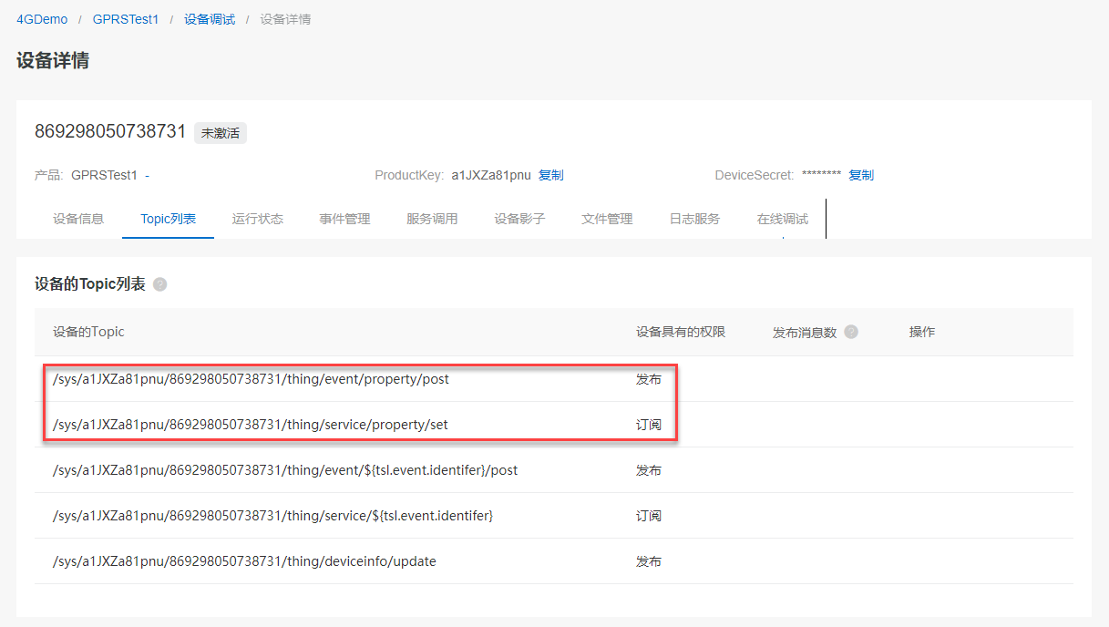 在设备详情页中, Topic列表 标签里有默认的Topic: