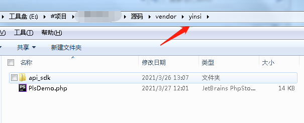 将解压的文件夹内的 api_sdk 文件夹与 api_demo 文件夹内的 PlsDemo.php,拷贝到项目 vendor 目录下,笔者这里是放在了yinsi文件夹