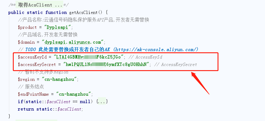 随后打开 PlsDemo.php文件,修改 getAcsClient 方法内对应的 AccessKeyId、AccessKeySecret