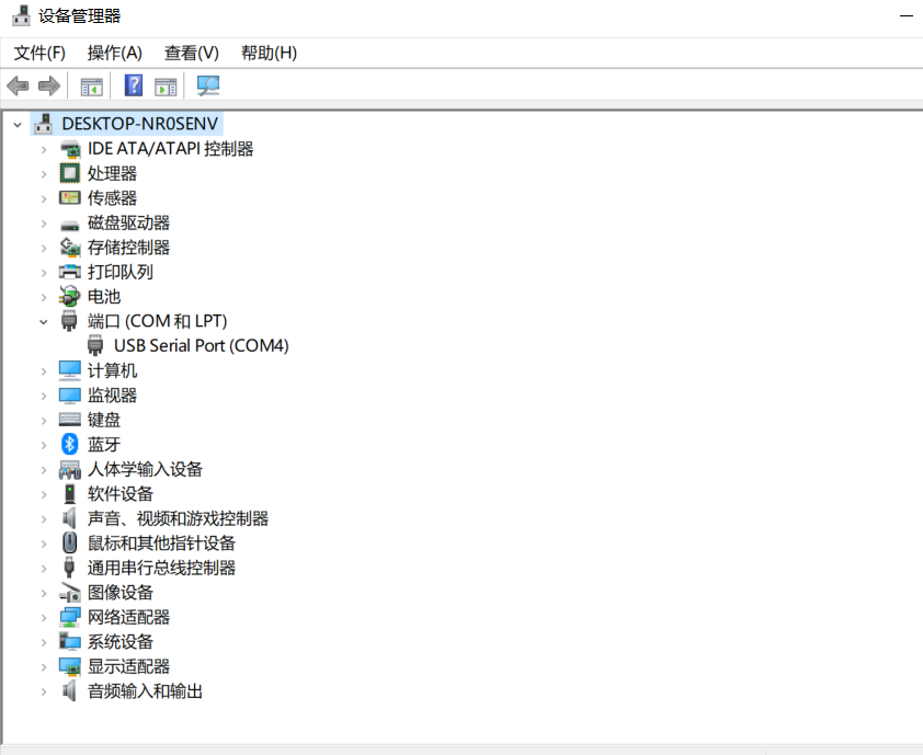 - 用数据线连接开发板和电脑,查看自己的电脑的默认串口端口(点击端口后先出来的端口),如果是Windows可以在控制面板搜索设备管理,我的是COM4,也有的电脑是COM5或其他的