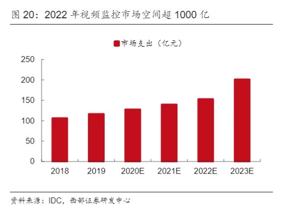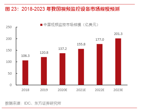 根据IDC的数据,我国视频监控设备市场规模2018年达到106.3亿美元,预计2023年达201.3亿美元,CAGR达到13.6%