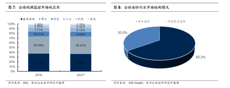根据BIS报告,2018-2023年全球视频监控结构基本相似,主要是在商业领域应用(36.84%),基础设施方面的应用占全球市场的36.54%。智能家居也占据一部分比例,在过去的几年中,安全和控制系统已成为最受欢迎的智能家居设备之一。