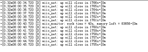 你看到的串口终端信息是这样的。信息是miio_net:ap will close in xxxxs。翻译一下就是小米网络提醒您,ap即将在若干秒后关闭。