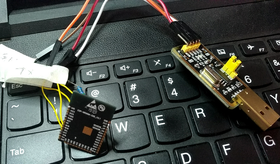 焊接的结果是这样的,注意USB串口模块的IO一定要配置成3.3V,否则会烧掉ESP32。