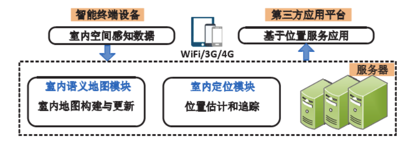 服务器:服务器的主要任务是接收、存储、分析和处理智能终端设备上传的室内空间感知数据,并将处理结果发送给第三方应用。服务器承担了整个系统的大部分计算负载,是系统的核心组件。服务器的主要模块包括室内语义地图模块和室内定位模块。室内语义地图模块的主要任务是利用室内空间的感知数据自动化、低成本、高精度地构建室内语义地图,并能够持续的、长期地更新数据。室内定位模块的主要任务是利用用户的室内空间感知数据高精度地估计用户当前在室内空间的位置信息,并能够实时地追踪用户的运动情况。