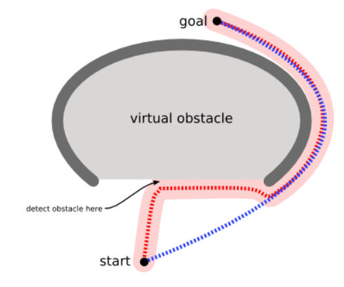 如上图所示,物体在start点,目标是goal。对于非智能体,一开始,很自然的,物体一直沿着红线往goal的方向运动,直到其检测到障碍物,然后改变方向,沿着U形障碍物找到它的红色的路径。相反的,如果存在路径规划(路径搜索器,pathfinder)物体将可以扫描一个更大的区域(整个空间),从而可以使物体不用走进U形障碍物而直接行走一条更短的路径(蓝色路径)。又或者如下图红色路径那样。Pathfinders let you plan ahead rather than waiting until the last moment to discover there’s a problem. There’s a tradeoff between planning with pathfinders and reacting with movement algorithms. Planning generally is slower but gives better results; movement is generally faster but can get stuck. If the game world is changing often, planning ahead is less valuable. I recommend using both: pathfinding for big picture, slow changing obstacles, and long paths; and movement for local area, fast changing, and short paths.