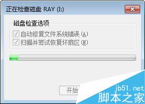 4、个人建议把自动修复文件系统错误和扫描并尝试恢复坏扇区两项都勾上,以防万一。然后单击开始