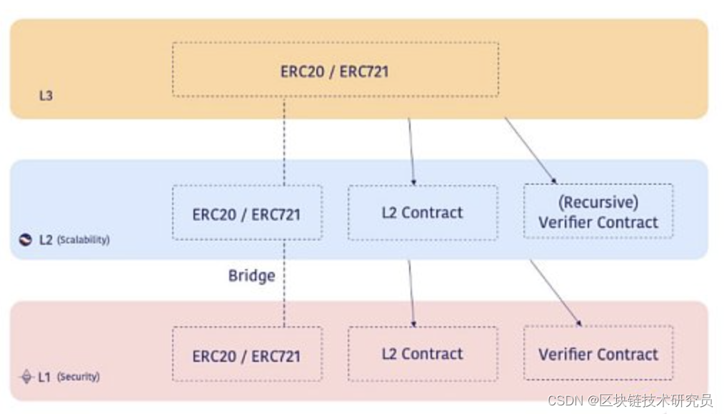 Layer3 如同 Layer2 嵌套在 Layer1上,它和 Layer2 之间也有着嵌套、递归的关系。通过递归证明的乘法效应,实现强大的可扩展性,同时这种扩容是呈几何级增长的,应用程序的设计者也能够更好地控制相关技术堆栈。通过自定义数据模型,加快区块链的技术周转率和功能运作效率。