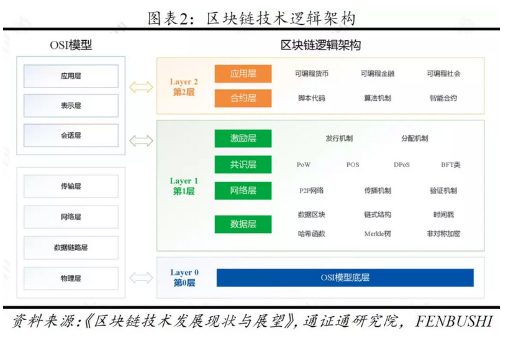 第1层和第2层对应OSI模型的5-7层(上层协议),第1层(Layer 1)包括数据层、网络层、共识层和激励层.