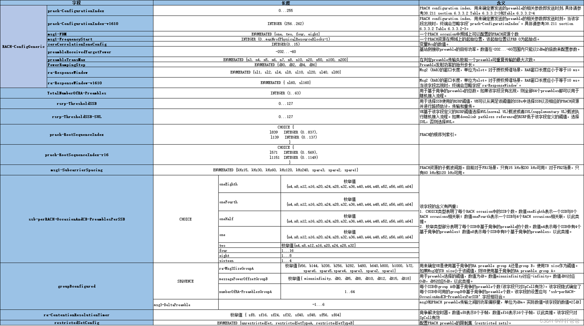 大家可能首先就会注意到'ssb-perRACH-OccasionAndCB-PreamblesPerSSB'这个参数,正如以上表格所做的解释:这个参数表明了每个RACH occasion对应的SSB个数以及每个SSB对应的基于竞争的preamble的个数。