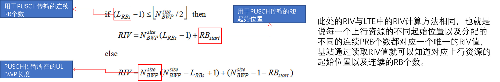 Msg3的PUSCH传输资源在频域上的位置则由以上公式中的RIV部分确定: