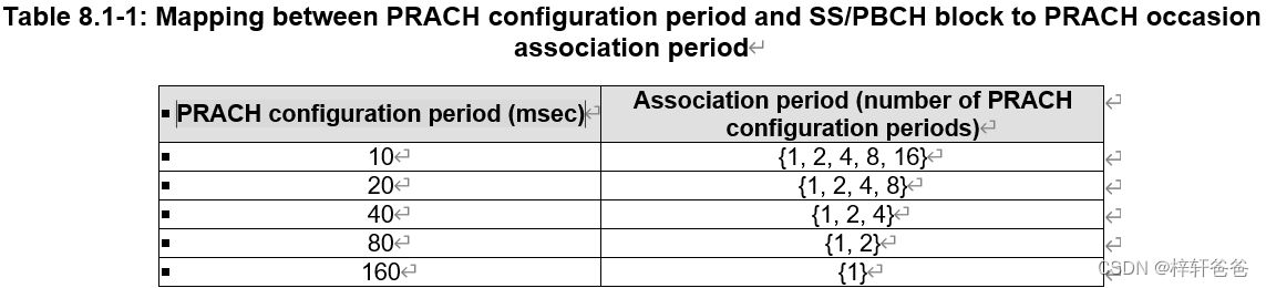 一个association period从系统帧0开始,其持续时长如Table8.1-1所示为PRACH配置周期的整数倍 ,最大为160ms。对于PRACH配置周期为10ms,20ms,40ms和80ms的场景,一个association period可以配置为对应PRACH配置周期的N倍(请参考以上Table 8.1-1)。此时N具体取哪个整数值由以下条件确定:对于某个特定的PRACH配置周期,如果其对应的association period可以取多个数值,则取其中满足可以使得每个SSB至少可以映射到一个PRACH occasion这一条件的最小的一个。