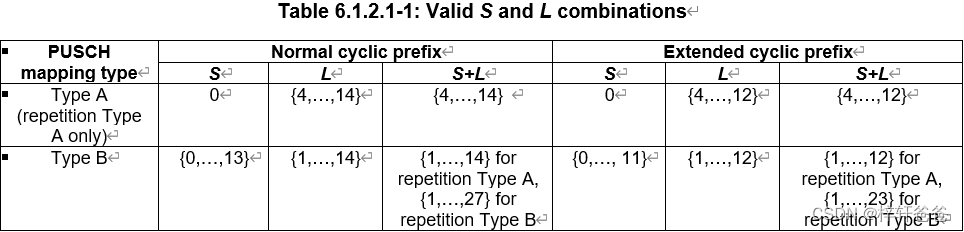 同时开始符号S和持续的连续符号个数L的确定还受PUSCH映射类型影响: