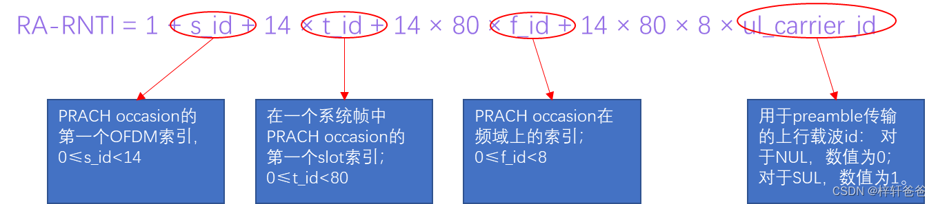 Msg2消息由PDSCH承载,对应的PDCCH由RA-RNTI加扰,RA-RNTI由以下公式计算得出: