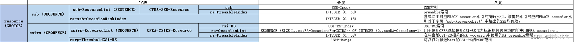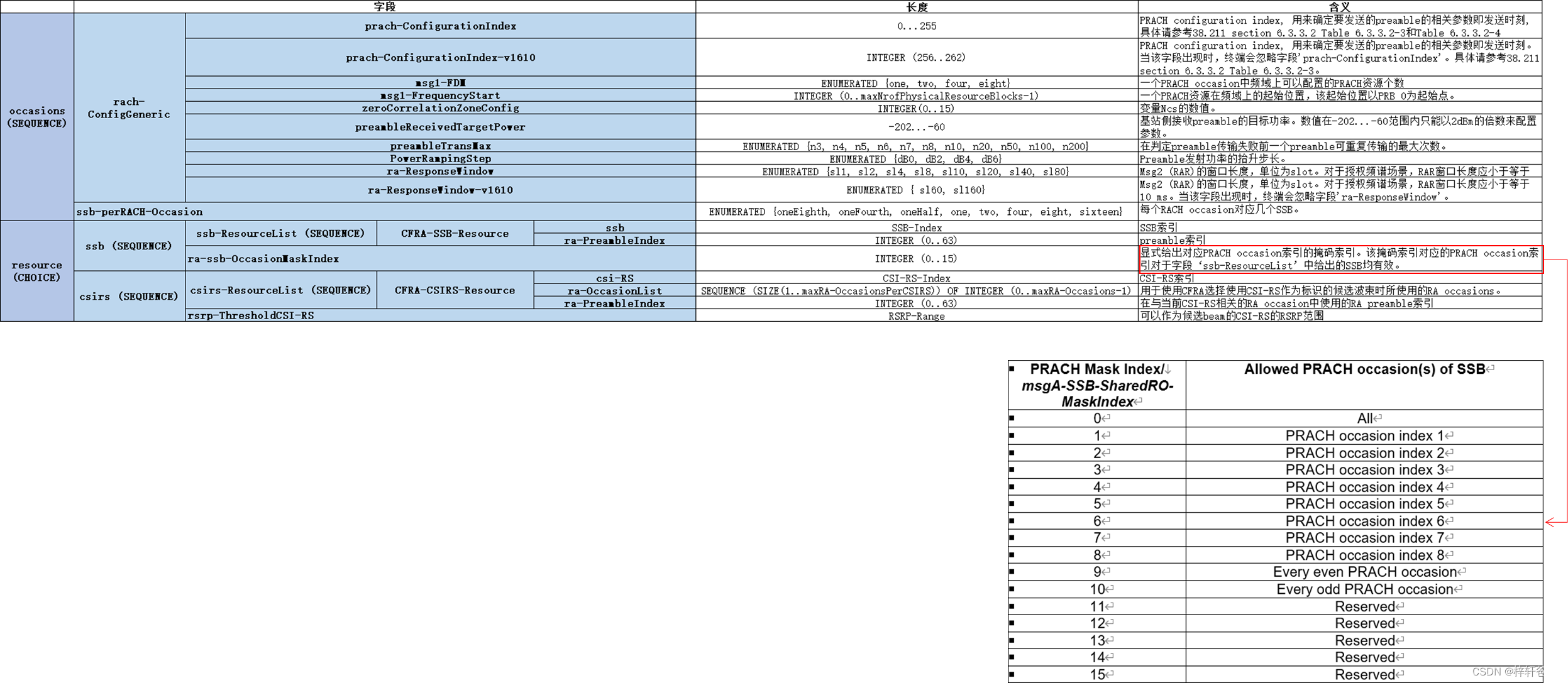 其中的csirs部分属于Beam Failure Recovery,与本博文主题无关,我们先不关注。以上表格中的信令参数ssb-ResourceList给出了随机接入所需要的SSB(由SSB-Index指定)和preamble(由ra-PreambleIndex指定);信令参数ra-ssb-OccasionMaskIndex则给出了发送preamble所需的PRACH occasion (由PRACH occasion索引指定)。