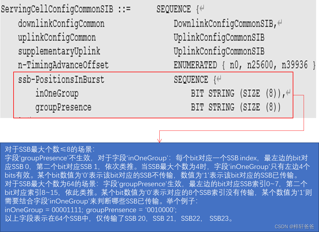 首先,终端必须知道基站有多少个SSB在周期性发送。终端通过系统消息SIB1中的信令参数'ssb-PositionsInburst'来知晓基站有多少个周期性发送的SSB: