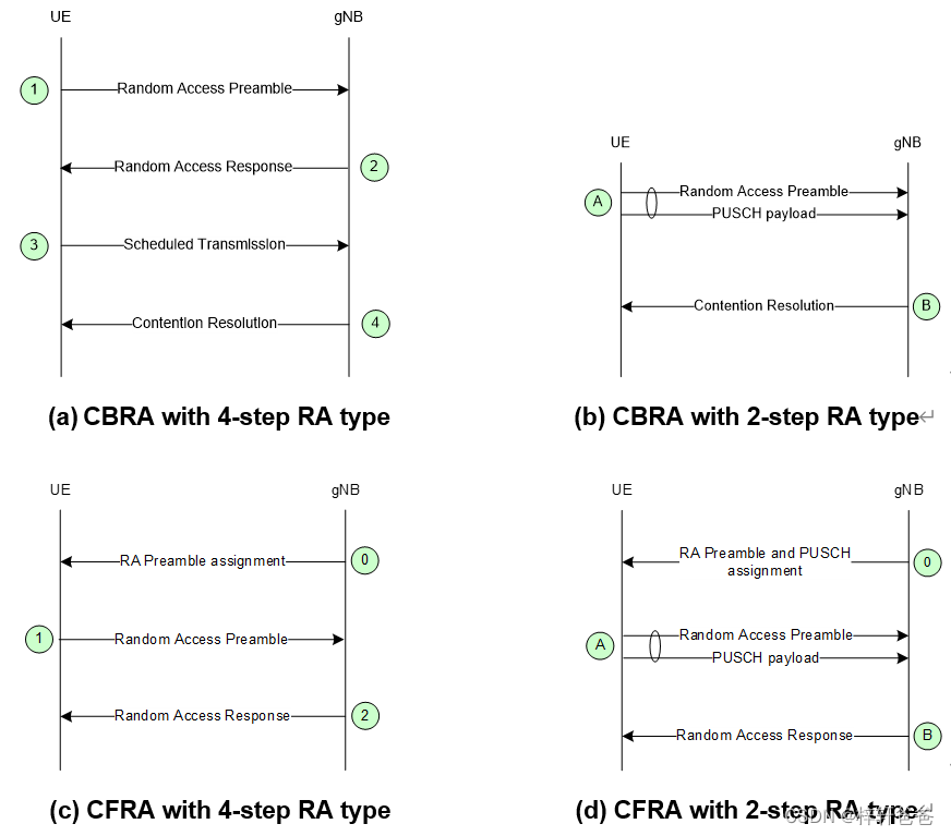 NR中的两种随机接入方式都支持基于竞争的随机接入流程 (Contetion-based RA)和非竞争的随机接入流程 (Contention-free RA),流程图如下:
