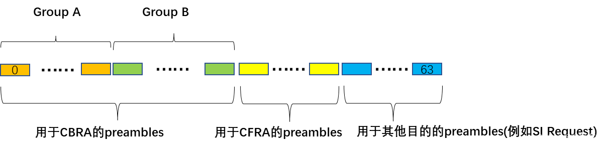 下面我们再说一下preamble的选择。preamble的选择过程和LTE中preamble的选择过程非常相似。在NR中,每个小区最多支持64个preamble,这64个preamble被分为三个部分,如下图所示: