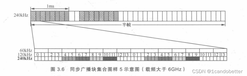 | 载波大于3GHz且小于6GHz | 一个同步广播块集合包含8个SSB,占用一个半帧的前四个时隙 |