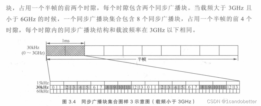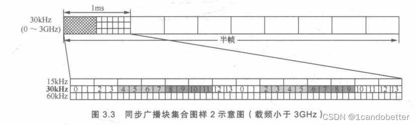 | 载波小于3GHz | 一个同步广播块集合包含4个SSB,占用一个半帧的前两个时隙,每个时隙包含两个SSB |