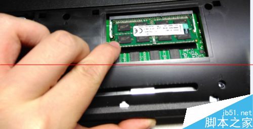 7、轻轻压下内存条,当听到“叮”的一声,表示卡槽已经卡好了内存条。此时内存已经正确插入电脑