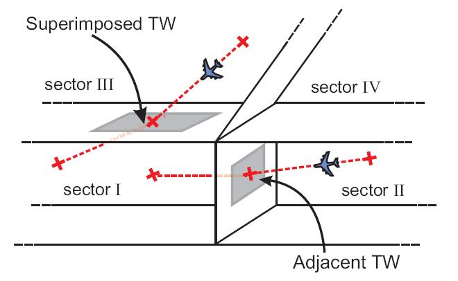 适应空中交通预期增长的一个主要难点是航班未来发展的不确定性。由CATS项目提出的目标窗口(TW)是在每架飞机飞行计划不同部分的扇区之间的放置空间和时间约束(图1),其位置和间隔大小反映了下游组件施加的约束,例如在目的地的准点率、连接的航路区域,或其他安全要求。它们代表了每个参与者(空中交通管制员、机场、航空公司、空中导航服务提供商)在特定约束集内交接特定飞机。
