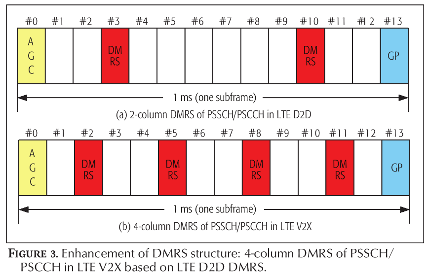 在传统的LTE系统中,两个参考信号之间的时间间隔为0.5毫秒。当传输信号的中心频率为6GHz,相对速度为280 km/h时,相干时间约为0.277 ms,低于当前参考信号的时间间隔。因此,由于信道估计不足和信道信息的缺乏,数据解调性能将会急剧下降。因为在传统的LTE参考信号设计中,可以校正的最大频率偏差约为1khz,当网络提供了同步参考时,相邻cell的UE的最大频偏可达2.2 kHz以上。这里的频率误差包含了网络和UE,UE之间的传输误差和多普勒频移。为了在高多普勒频移的场景下提高性能,如:在满足信道估计和同步跟踪的前提下,将PSSCH和PSCCH一个子帧内的解调参考信号(DMRS)的列数从2个增加到4个,以获得更好的链路级性能。由于在DMR序列中没有利用用户身份信息,因此考虑了PSSCH的SA循环冗余校验(CRC)和PSCCH的固定参数随机选择,避免了UE之间的干扰。LTE V2X的DMRS结构的改进如图3所示。