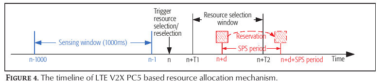 感知和SPS资源分配的具体机制如图4所示。UEs应该在一个1000毫秒的滑动传感窗口中,在每个接收子帧中继续检测来自其他UEs的传输。如果资源选择或重新选择被触发,UE将在资源选择窗口中选择可用的资源。资源选择窗口的上边缘受当前有效载荷延迟的限制,而资源选择窗口的下边缘则由基于UE s实现的进程延迟决定。根据感知窗口中检测到的资源占用状态,如果一个UE选择的可用资源在资源选择窗口的(n + d)子帧,那么相同的频率 资源(n + d + SPS周期)将会被在(n+d)传输的SA预留。