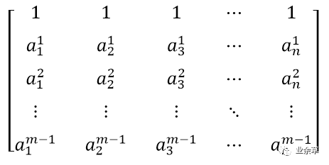 在线性代数中有一种矩阵称为范德蒙德矩阵,它的任意的子方阵均为可逆方阵。一个m行n列的范德蒙德矩阵定义如下,其中Ai 均不相同,且不为0。