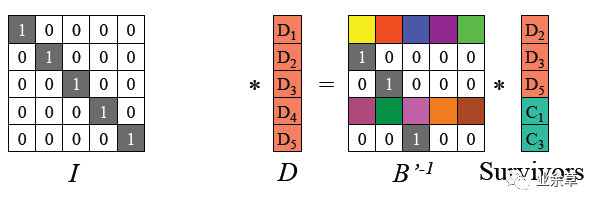 编码矩阵就是单位矩阵和范德蒙德矩阵的组合。输入数据(D)和编码矩阵的乘积就是编码后的数据。
