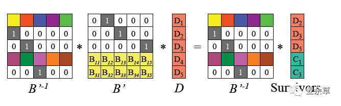 上图最左边是编码矩阵(或称为生成矩阵、分布矩阵,Distribution Matrix),编码矩阵需要满足任意n*n子矩阵可逆。