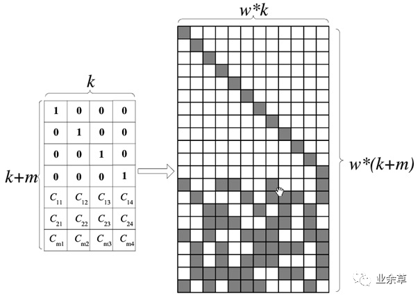 在GF(2^w)域中的编码矩阵为K*(K+m),转换到GF(2)域中,使用二进制矩阵表示,编码矩阵变成了wk* w(k+m)二进制矩阵。
