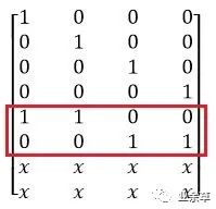 上图中,黑色方块表示逻辑1,白色方块表示逻辑0。通过这种转换,GF(2^w)域中的阵列就可以转换成GF(2)域中的二进制阵列。生成矩阵的阵列转换表示如下: