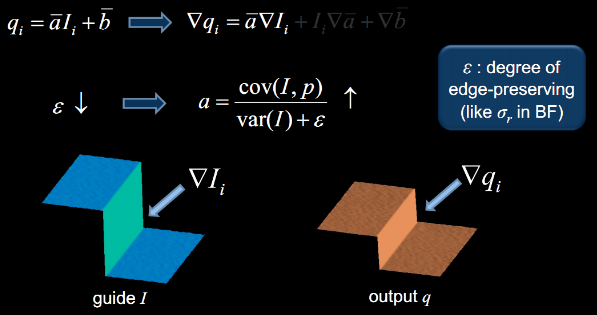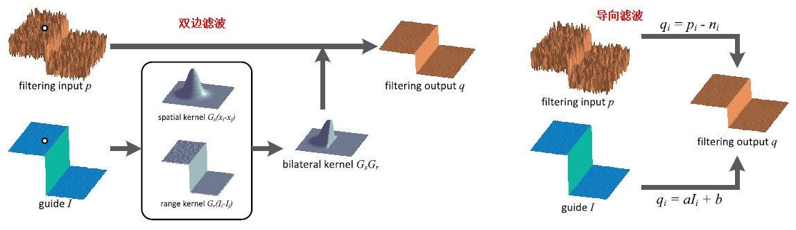 导向滤波是一种自适应权重线性滤波器,由下图可知,输出图像定义为输入图像去除噪声后的结果图像,同时输出图像中的梯度信息与导向图的梯度信息保持一致,导向的含义亦在于此,通过引入特定的图像梯度信息作为参考,达到保留边缘特性的目的。