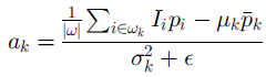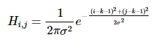 使用高斯函数计算掩模矩阵,对于尺寸为(2k+1)x(2k+1)的窗口模板,其掩模矩阵的系数值的计算公式为: