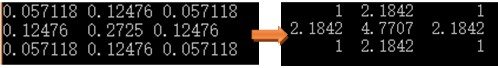 在进行掩模矩阵(3x3)的归一化处理时,将矩阵左上角的系数值作为归一化运算的分母。