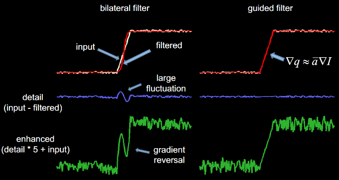 在细节增强应用中,下图展现了导向滤波的另一个特性,避免梯度翻转的情况。(导向图与输入图相同)