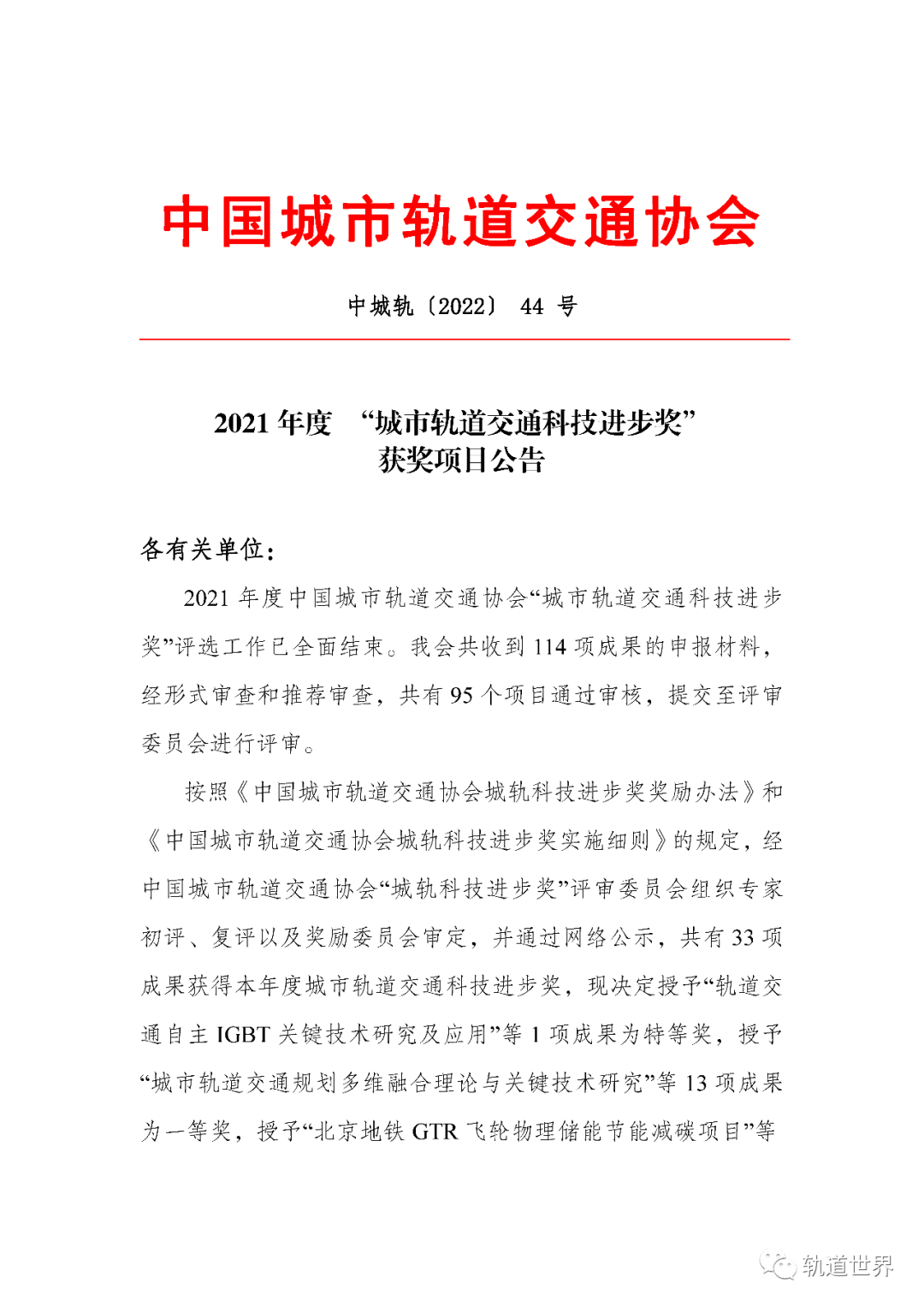 (1)2021年度城轨科技进步奖名单