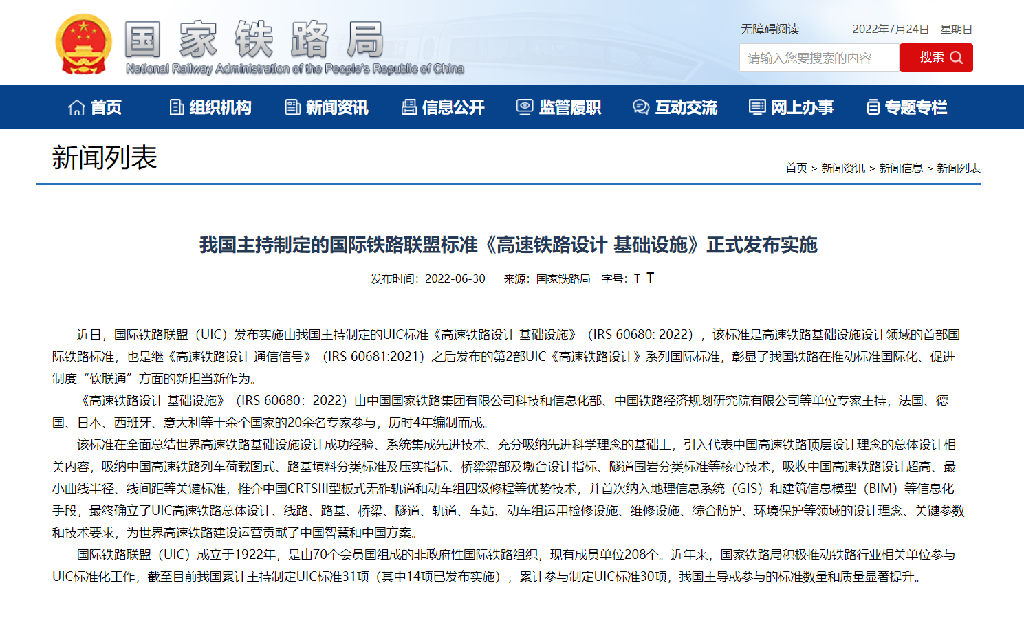 导读:国际铁路联盟发布实施由我国主持制定的《高速铁路设计 基础设施》标准和《高速铁路设计 供电》标准,两项标准均是相关领域的首部国际铁路标准,此次发布的两项高铁标准由中国国家铁路集团有限公司组织专家主持制定。