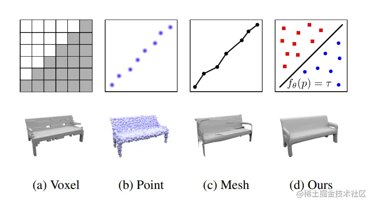 现存的表示方法能够大概分成三类:体素、网格、点云,这些 3 维表示方法在储存、结构和是否利于学习等方面。各有一些优点和不足,并不理想直到占用网络出现