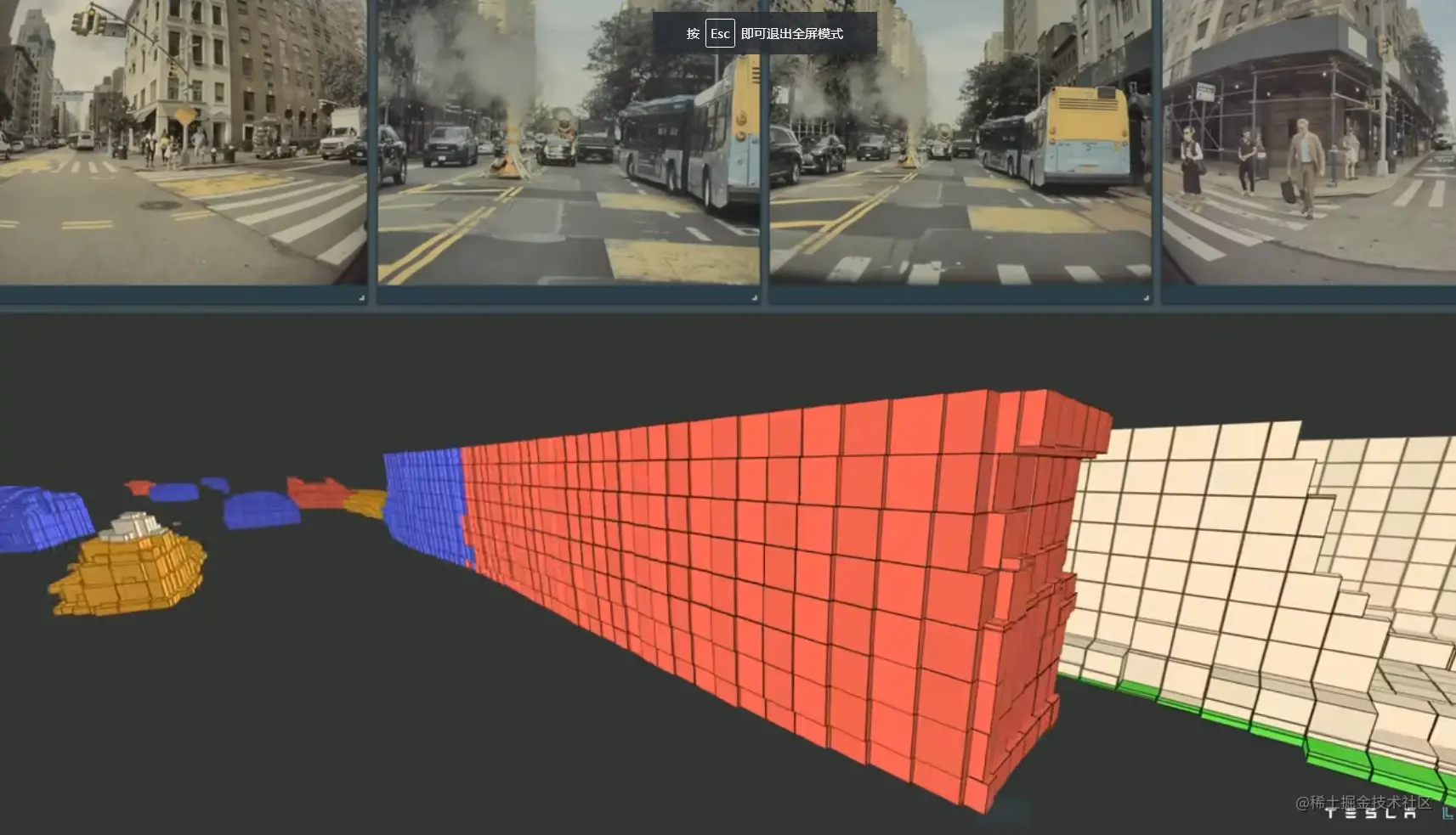 通过占用网络,特斯拉可以把一些当前场景下遮挡静止物体和动态物体也用体块来表示出来,这样就增加 tesla 的视野域,让特斯拉可以对接下来路径规划有了更多信息。