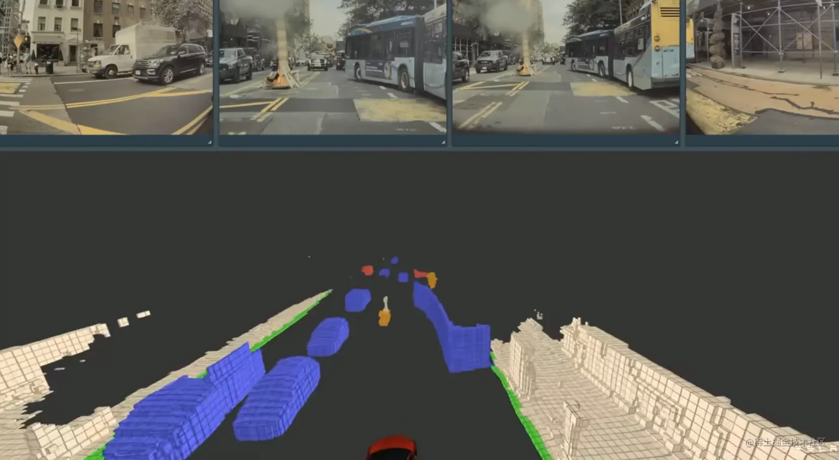 蓝色小块堆叠形成物体为运动物体,在画面里不难看出这些是道路上运动的车辆和周围静止物体在占用网络中是明显区别