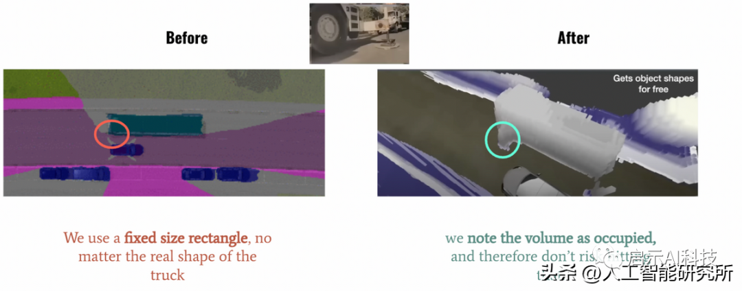 对比鸟瞰图,Occupancy Networks网络呈现出来的是一个3D场景,这样系统就可以看到真实物体的3D体积