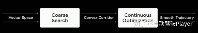 Tesla 规控团队的解决方案是分层分解,思路与Apollo 的规划算法相似。首先,使用粗搜索的方法将非凸性分解,将问题转化为凸空间的优化,然后使用优化算法得到最终的平滑轨迹。