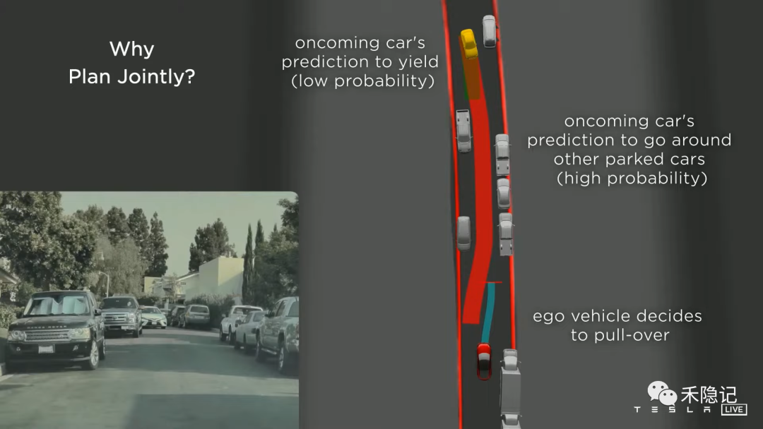 因此除了单车规划外,特斯拉还做了交通参与者联合轨迹规划,根据其他车的状态参数(速度、加速度、角速度等)规划其路径,进而选择合适的自车方案,待其他车状态发生变化后,随时调整自车方案,尽量避免出现自车愣在原地不做反应的情况,提升自车的smart性。
