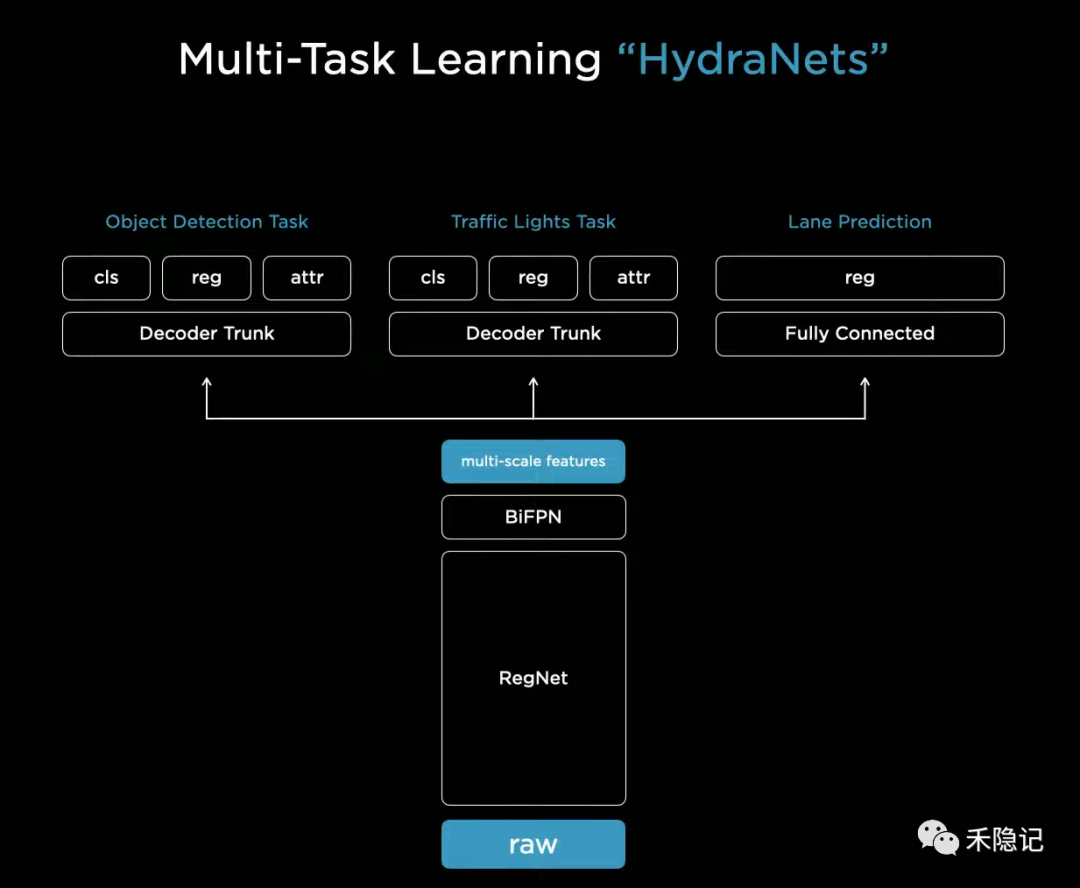 特斯拉视觉感知网络的基础结构是由主干(Backbone)、颈部(Neck)与多个分支头部(Head)共同组成,特斯拉取名为“HydraNet”,取意自古希腊神话中的九头蛇。